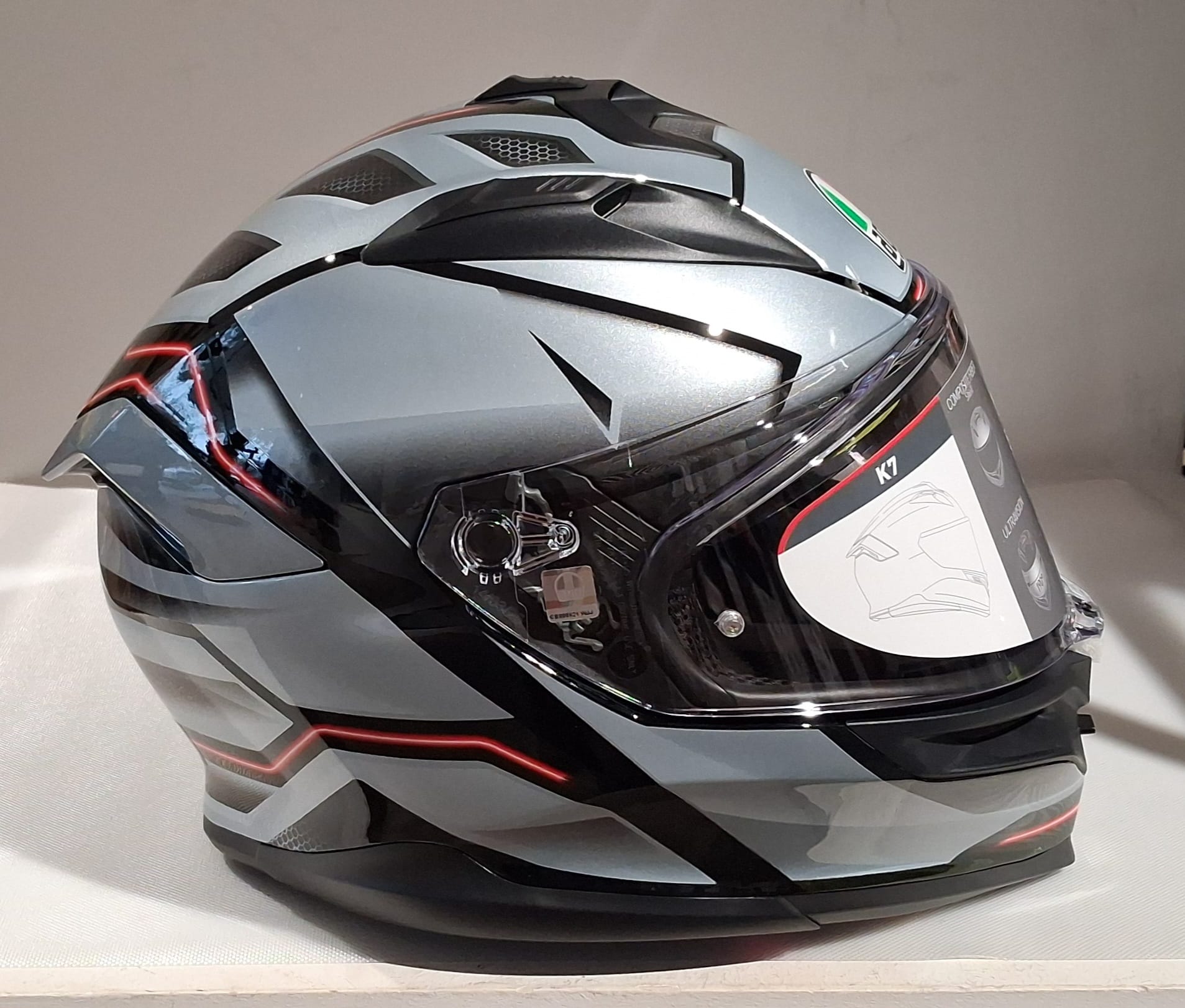 Protezione estrema, nel casco più compatto della sua categoria, per ogni uso su strada. K7 è il perfetto equilibrio tra sportività e turismo, portato al massimo dell’evoluzione. Adatto ad ogni tipo di guida e ad ogni percorso stradale, questo casco racchiude il meglio delle caratteristiche del mondo sportivo e del touring, per affrontare qualsiasi sfida su due ruote. Dalle pieghe più impegnative alle lunghe avventure in sella. La calotta in fibra composita del K7 offre un’eccellente protezione, rendendolo il casco integrale stradale più compatto della sua categoria, leggerezza irrinunciabile con un peso di soli 1.450 g nella prima taglia di calotta. Gli interni premium, realizzati in morbido tessuto con trattamento DrySpeed ad assorbimento rapido del sudore, offrono un comfort estremo, permettendo al pilota di concentrarsi solo sulla strada. La visiera panoramica antigraffio Ultravision, con un campo visivo di 190°, consente una visione chiara e ampia della strada e degli ostacoli, in ogni posizione di guida. La visiera, il visierino solare integrato e il sistema anti-appannamento Pinlock® 120 Max Vision™ garantiscono una visibilità perfetta in tutte le condizioni.