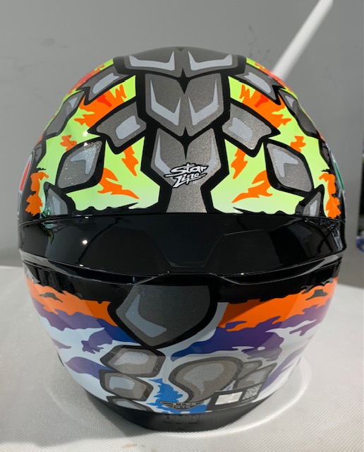 La grafica è un omaggio all’animale simbolo del pilota, lo Scorpione, segno zodiacale dello stesso Bez, che si staglia verticalmente lungo tutta la calotta.