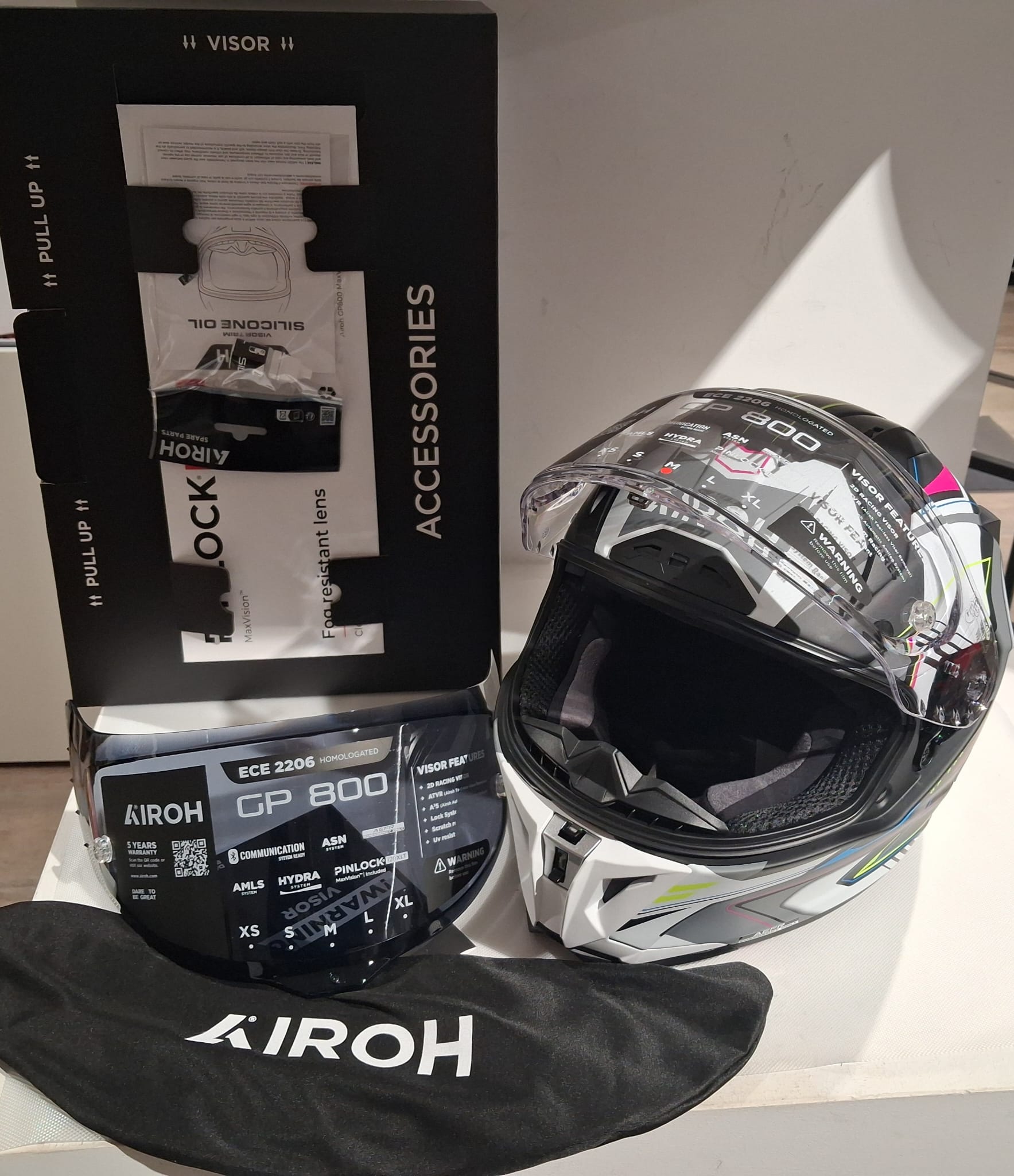 Dentro la scatola: Double stop wind (summer and winter) | Pinlock® 120 XLT MAX VISION INCLUDED | Dark smoke visor | Removable nose cover | Visor Bag